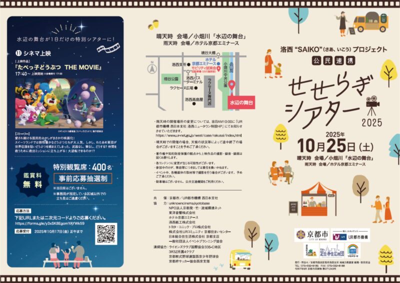 独立行政法人都市再生機構(以下「UR都市機構」)及び京都市は、京都市西京区の洛西ニュータウン内を流れる小畑川「水辺の舞台」で屋外シネマイベント・公民連携「せせらぎシアター2025」を10月25日(土曜日)に開催します。