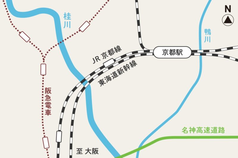 ※桂川は京都市西部を南北に流れる河川で、京都市の都心部から走るJR線や阪急線は、桂川を西に超えて、高槻市や吹田市を経て大阪市内に続いている。