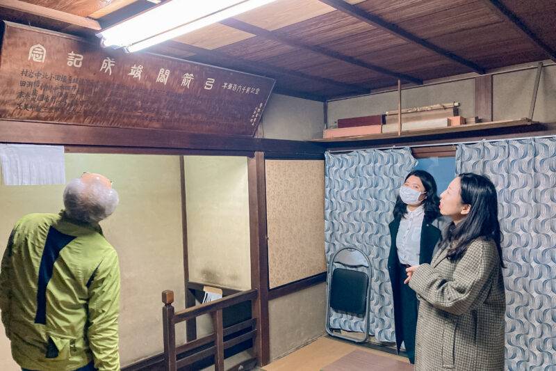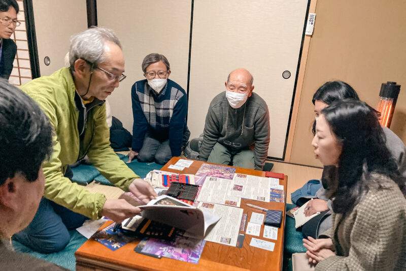 町内の方々に弓箭閣(きゅうせんかく)の歴史や武具飾りについて話を聞く