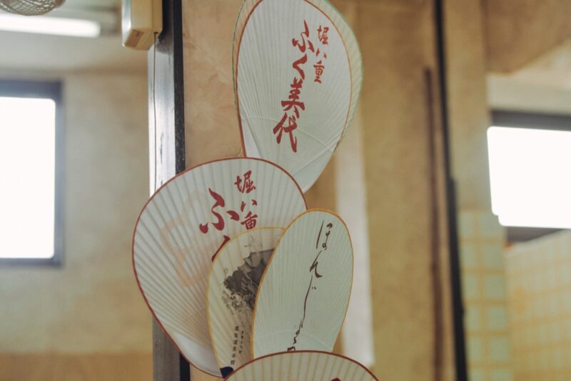 芸妓さんや舞妓さんの名入りのうちわ「京丸うちわ」。大黒湯へ通う舞妓さんたちの京丸うちわが飾られている。