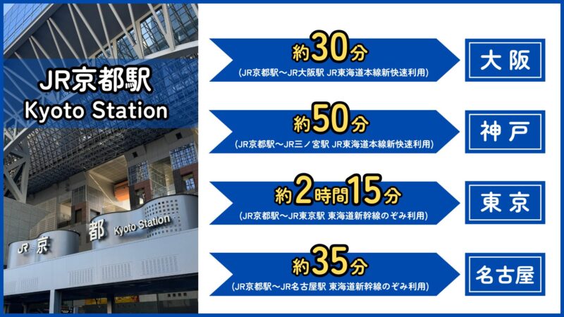 市内移動はもちろん、大阪までは約30分、東京までは新幹線で約2時間15分と、スムーズに都市間移動が可能です。