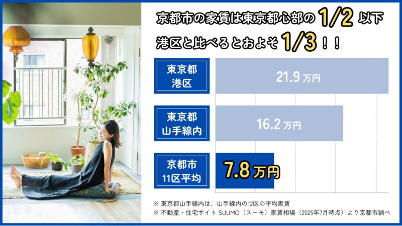 京都の家賃は東京都心部の1/2以下!家賃だけでも年間約100万円もおトクになる計算です。