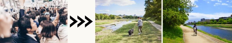 京都市の人口密度は東京23区のおよそ1/9!過酷な通勤ラッシュからも解放されて、ゆとりと余白ある生活を送ることが可能です。