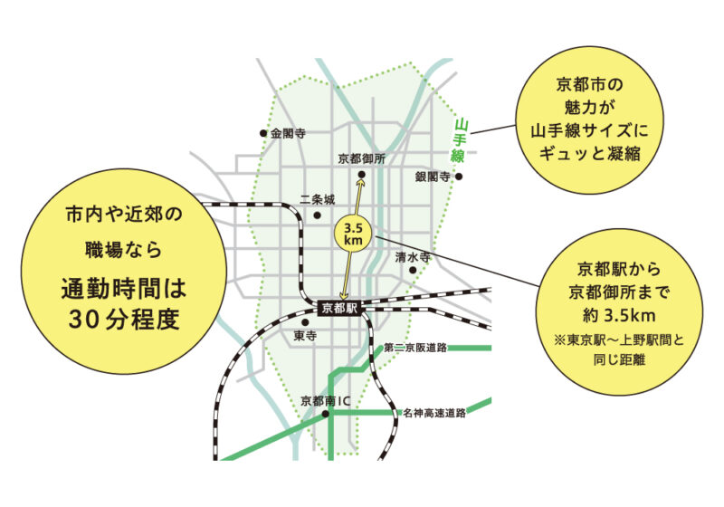 京都市の市街地は東京の山手線並みのサイズで職住近接の便利な生活が魅力!